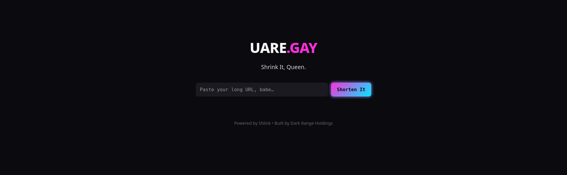 short.uare.gay is a lightweight Shlink-powered URL shortener wrapped in a simple, playful frontend. It runs as a clean utility service inside the DRH ecosystem—fast redirects, basic analytics, and a memorable domain that leans into DRH’s irreverent branding. It’s intentionally minimal: Shlink handles all link management and API logic, Cloudflare handles DNS and routing, and the frontend serves as a quick interface for creating and sharing short URLs. Straightforward, durable, and easy to maintain.