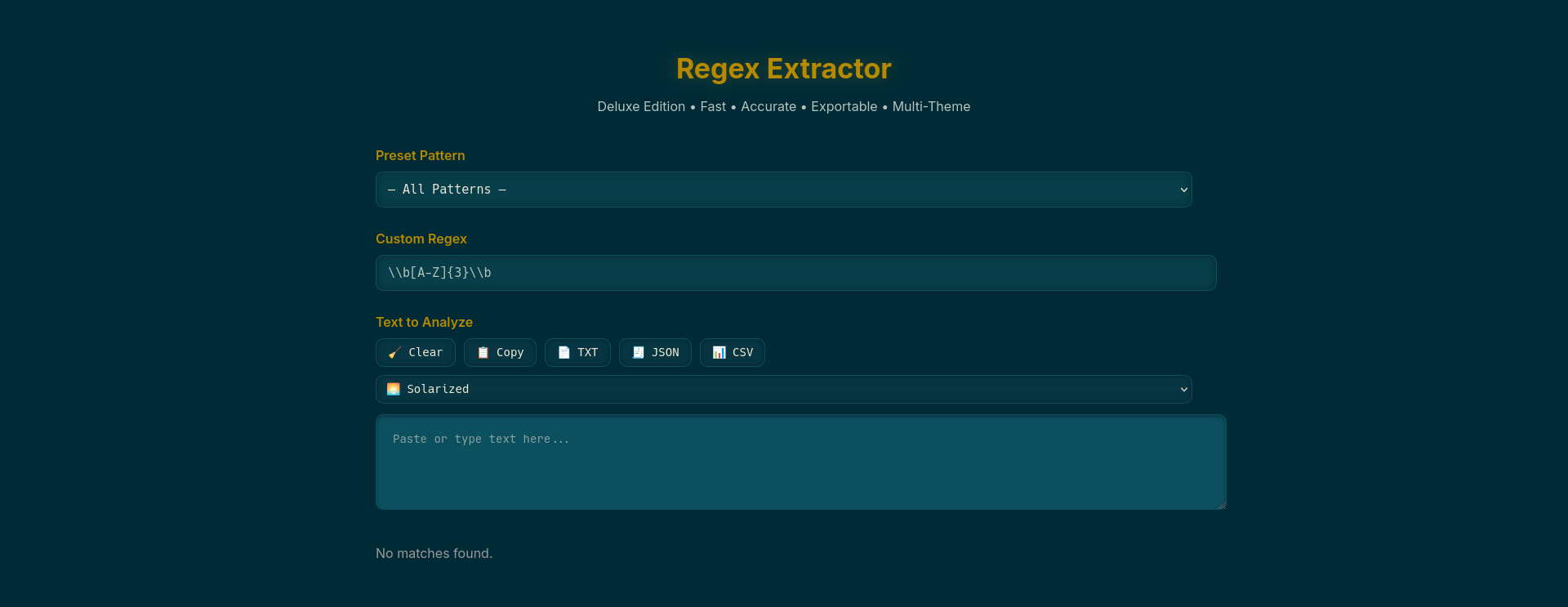 Regex Extractor — A fast, lightweight pattern-sniper for messy text. Drop in any block of data and the DRH Regex Extractor instantly pulls out emails, URLs, IDs, numbers, custom patterns—whatever you aim at. No logins, no footprint, no limits. Just pure extraction.