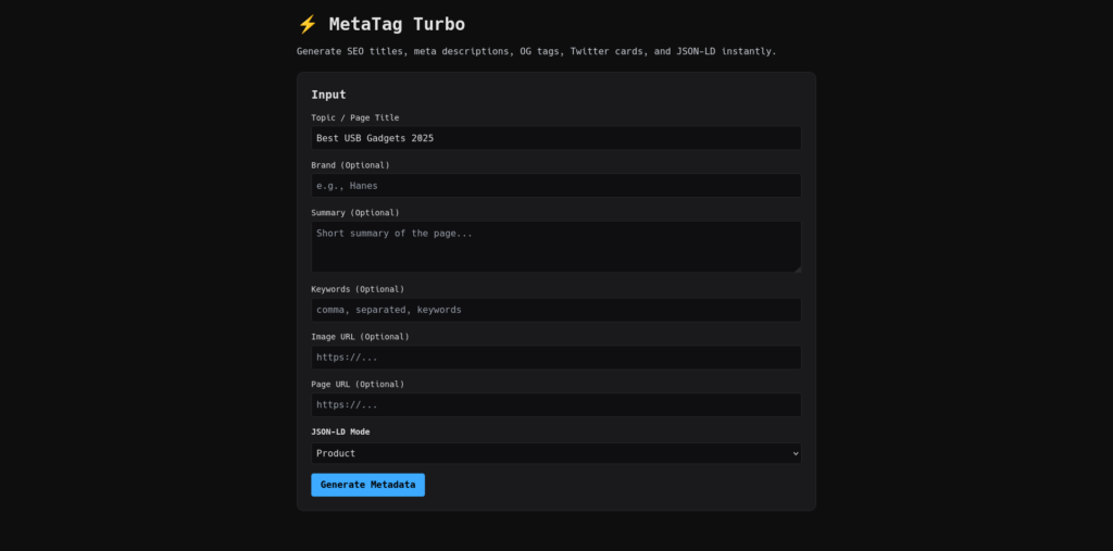 Meta Tag Turbo — A tongue-in-cheek tribute to the cult of metadata, disguised as a frictionless “SEO helper.” MetaTag Turbo reduces the vast, mystical universe of search optimization into a handful of text boxes and a shiny blue button — because nothing says expertise like confidently generating an entire site’s identity in 0.2 seconds. Behind the minimalist interface lurks a satire of modern webcraft: a world where titles are trimmed by character count religion, descriptions are diced into 160-character haikus, and JSON-LD is treated like sacred scripture handed down by the Algorithm itself. Efficient, smug, and blissfully unaware of its own absurdity, MetaTag Turbo is a micro-shrine to today’s ritualistic metadata obsession — the belief that if you polish the tags hard enough, enlightenment (or at least click-through) will follow.