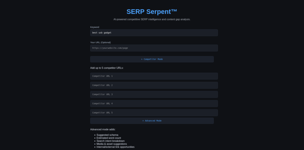 Serp Serpent — is a smug little oracle that pretends to “analyze the SERP” while actually parodying the entire SEO prophecy industry. It turns keyword angst into collapsible enlightenment—content gaps, competitor sins, and holy H1 patterns—served with the confidence of a tool that sees Google’s soul (or pretends to). A compact shrine to our obsession with reverse-engineering the Algorithm.