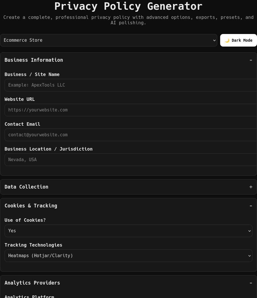 Privacy Policy Generator — A browser-native privacy engine for websites, apps, and SaaS. Choose presets, refine details, and export fully-formatted policies instantly. Private by design, optimized for speed, built for the modern web.